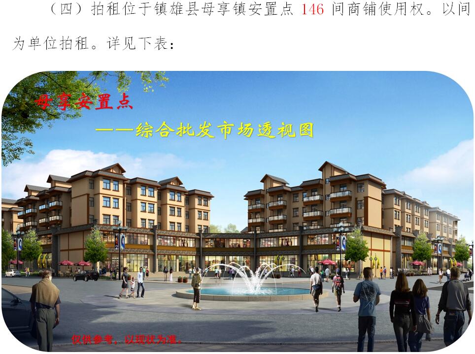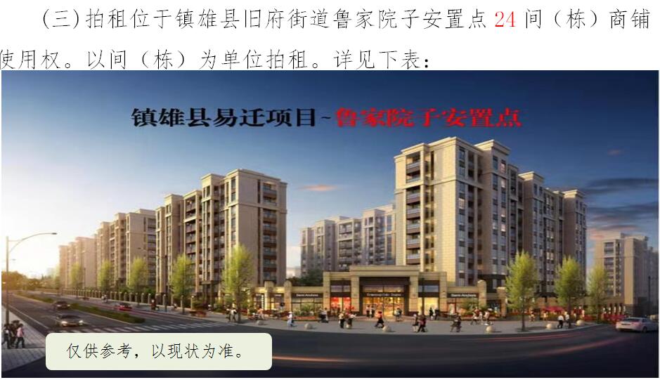 經(jīng)鎮(zhèn)雄縣人民政府批準(zhǔn),受相關(guān)部門(政府)委托,公開(kāi)拍租位于鎮(zhèn)雄縣易地扶貧搬遷工程呢嚕坪安置點(diǎn)7棟獨(dú)立商鋪使用權(quán)、高山大地安置點(diǎn)27間(棟)商鋪使用權(quán)、魯家院子安置點(diǎn)24間(棟)商鋪使用權(quán)、母享安置點(diǎn)146間商鋪使用權(quán)、以勒物流城安置點(diǎn)67間(棟)商鋪使用權(quán)、碗廠安置點(diǎn)114間商鋪使用權(quán)。相關(guān)事項(xiàng)如下: