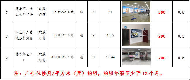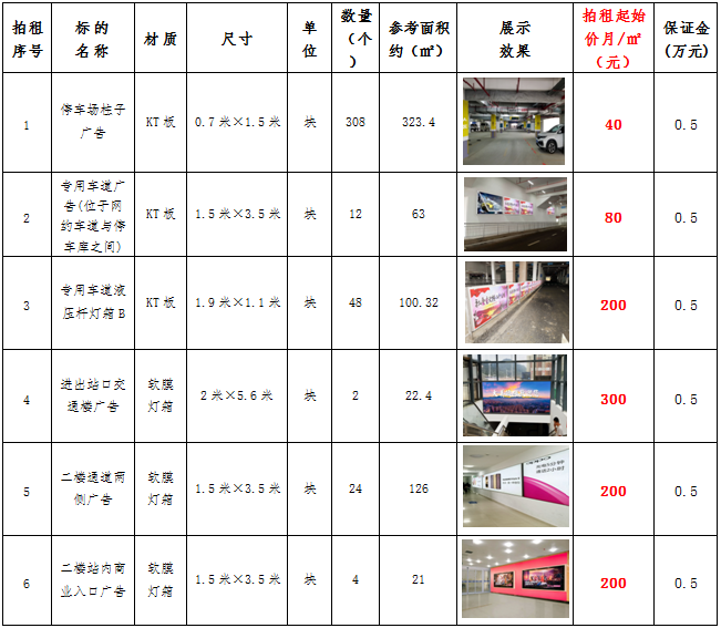 (六)拍租鎮(zhèn)雄縣開元商業(yè)物業(yè)服務有限公司以勒高鐵站站前廣場各類廣告位使用權,廣告位分布、類型、規(guī)格及展示效果如下: